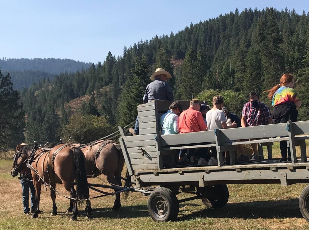 Wagon Rides & Dinner – Bring your family or group of friends and come for an adventure that takes you back in time. Our horse drawn wagon with take you for a 20-30 minute tour of our meadow where there might be cattle, horses, deer, elk or other wild animals to see. When you return to our barn area you will find steaks cooking on the grill and a full “cowboy” dinner of potatoes, baked beans, green salad, homemade bread and jams. Finish up with dessert cooked in a Dutch oven and served with ice cream or make s’mores in the campfire.
