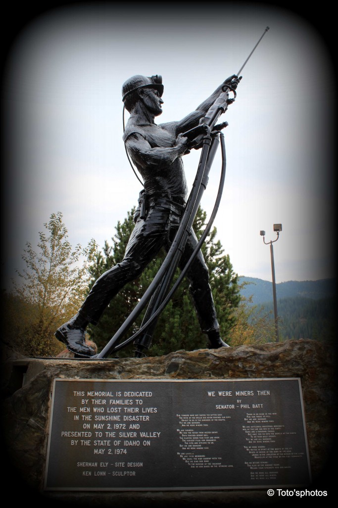 A 13-foot-tall metal miner, with a glowing headlamp, memorializes the Sunshine Mine disaster of 1972. The statue stands behind 91 miniature tombstones, one for each miner who suffocated in a smoky fire at America’s largest silver mine. The metal-sculpted hard rock miner eternally beams his cap lamp toward the site of one of America’s worst mining disasters.