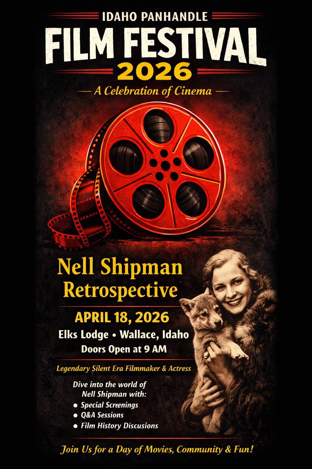 A one day event featuring family, friendly films from around the world. This year, our special event and guest speakers will focus. On Nell Shipman and her contribution, not only to North Idaho, but to films in general.
