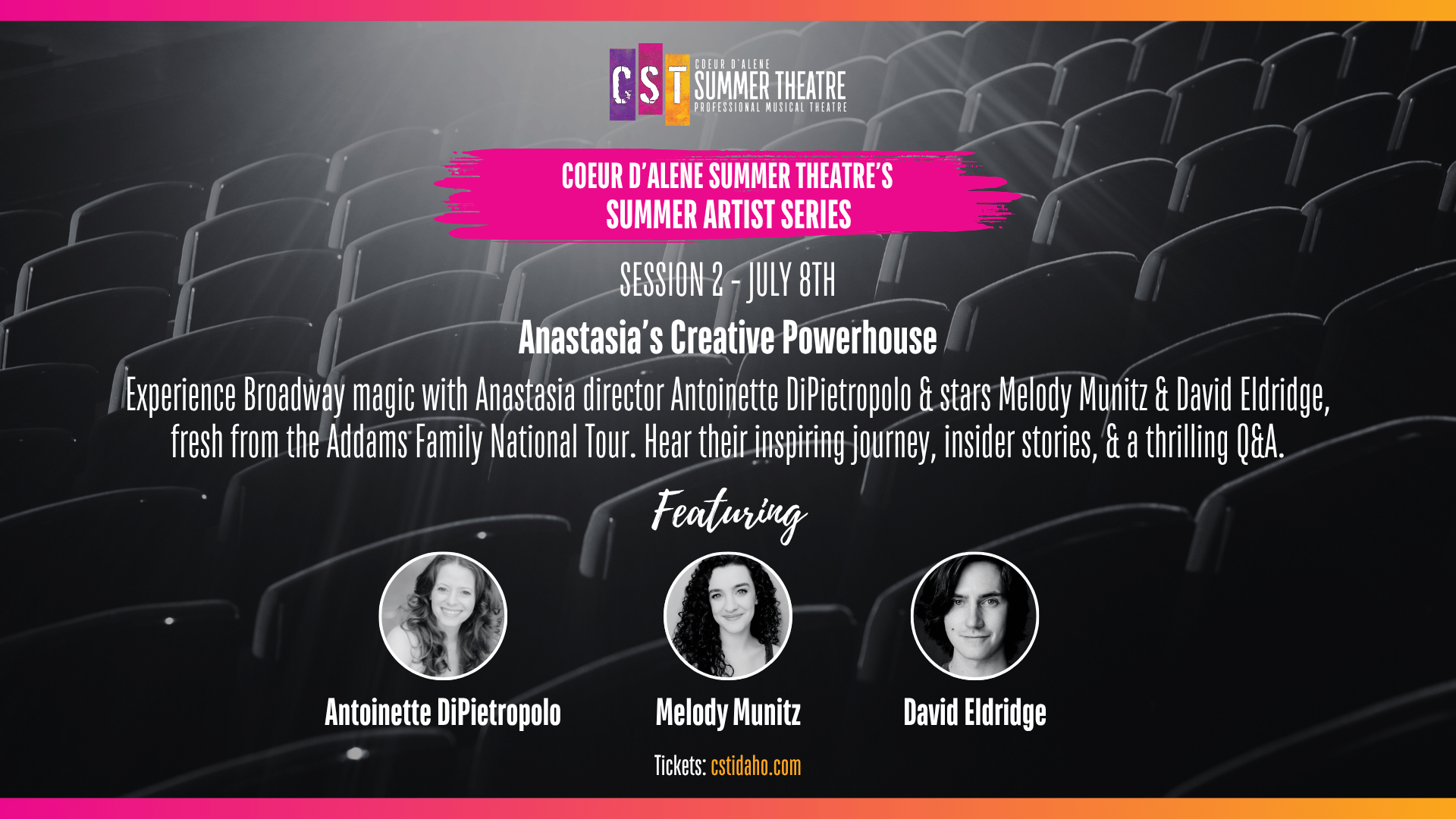 Experience Broadway magic with Anastasia director Antoinette DiPietropolo & stars Melody Munitz & David Eldridge, fresh from the Addams Family National Tour. Hear their inspiring journey, insider stories, & a thrilling Q&A.